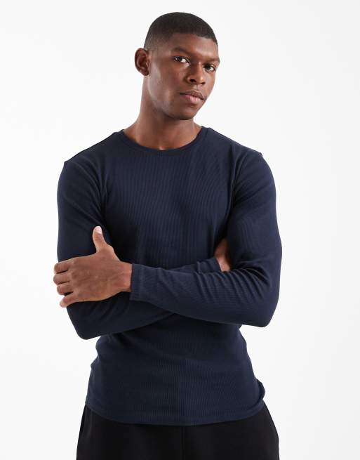 ASOS DESIGN - Basic - Muscle fit T-shirt met lange mouwen in marineblauw geribd