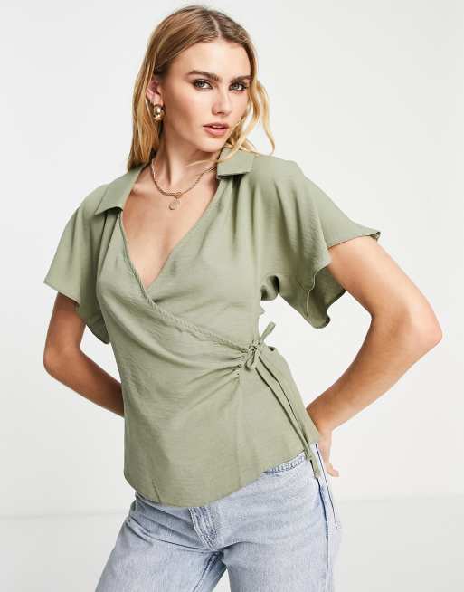 ASOS DESIGN - Blouse met overslag en kraagje in khaki