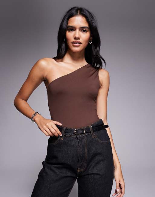 ASOS DESIGN - Body van glad polyamide met blote schouder in chocoladebruin