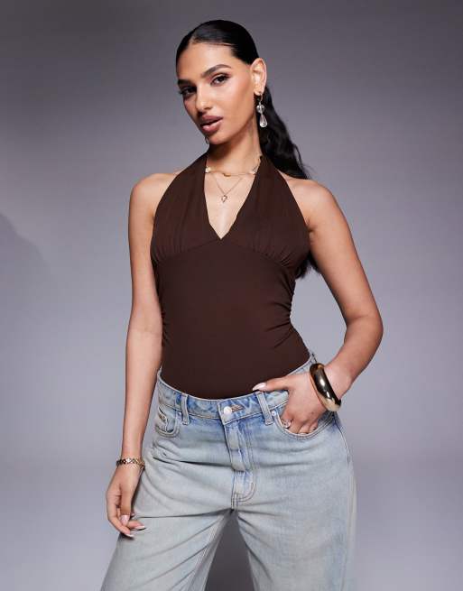 ASOS DESIGN - Body van polyamide met laag uitgesneden halternek in chocoladebruin