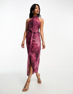 ASOS DESIGN - Bodycon midi-jurk van mesh met halternek en gevlekte bloemenprint in paars