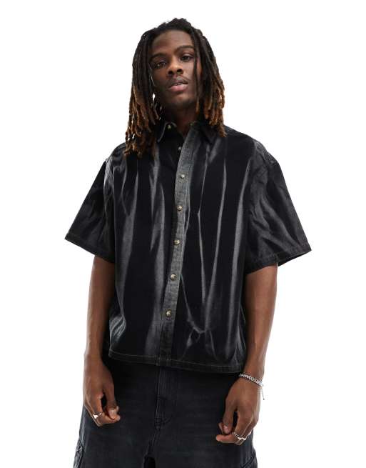 ASOS DESIGN - Boxy oversized denim overhemd met korte mouwen en acid wash-strepen in zwart