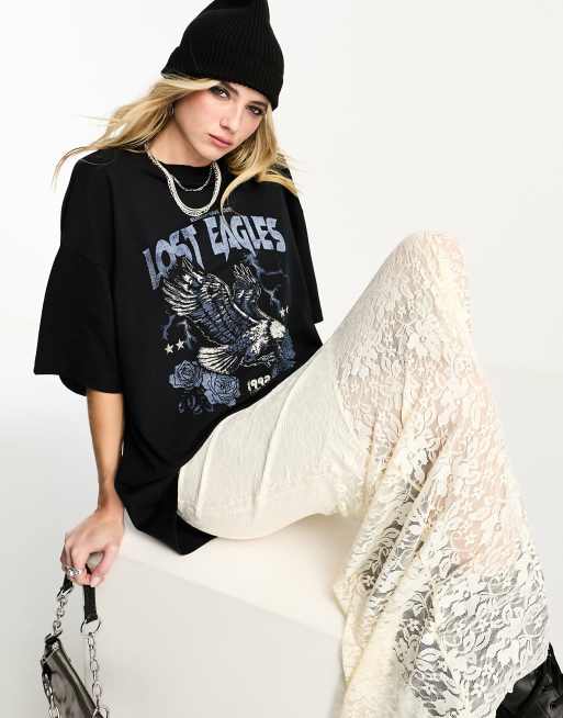 ASOS DESIGN - Boyfriend-fit T-shirt met grafische Lost Eagles-rockprint in zwart