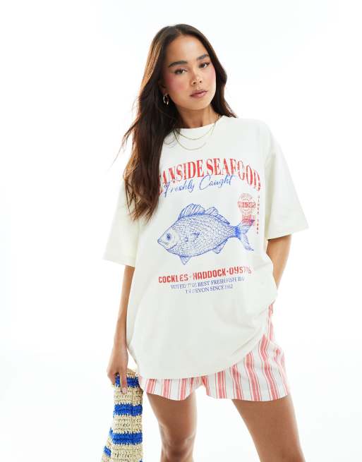 ASOS DESIGN - Boyfriend T-shirt met 'Oceanside Seafood' print in crème