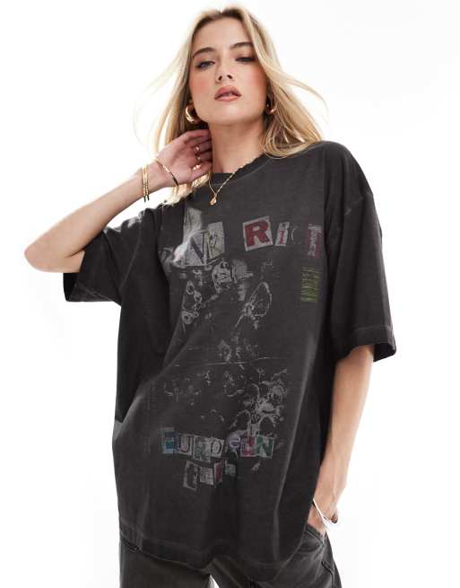 ASOS DESIGN - Boyfriend T-shirt met 'Punk Rich'-rockprint in antraciet met wassing
