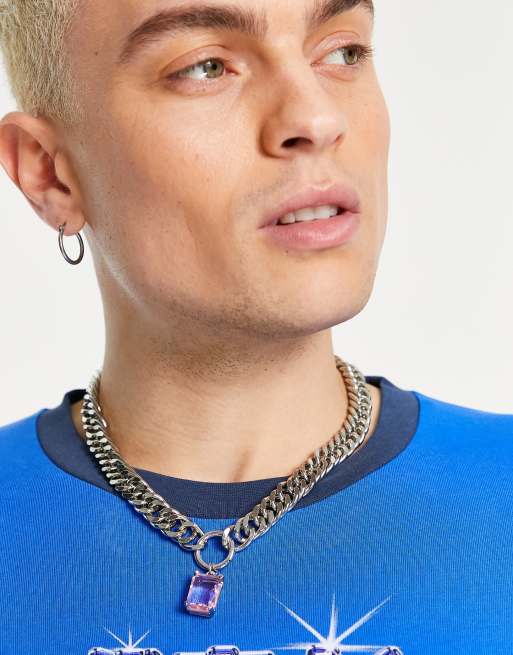 ASOS DESIGN - Brede schakelketting in zilverkleur met vierkante kristalhanger in roze