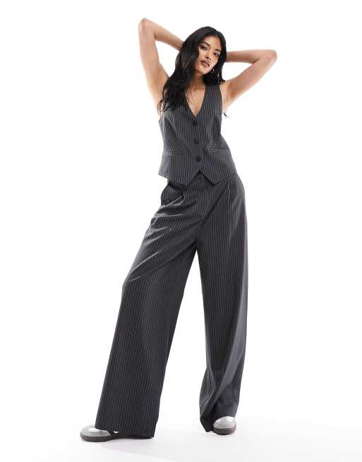 ASOS DESIGN - Broek met wijde pijpen en krijtstrepen in grijs, deel van co-ord set