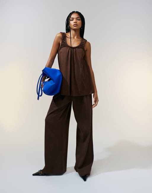 ASOS DESIGN - Broek met wijde pijpen en plooi aan de voorkant van zware stof in chocoladebruin, deel van co-ord set