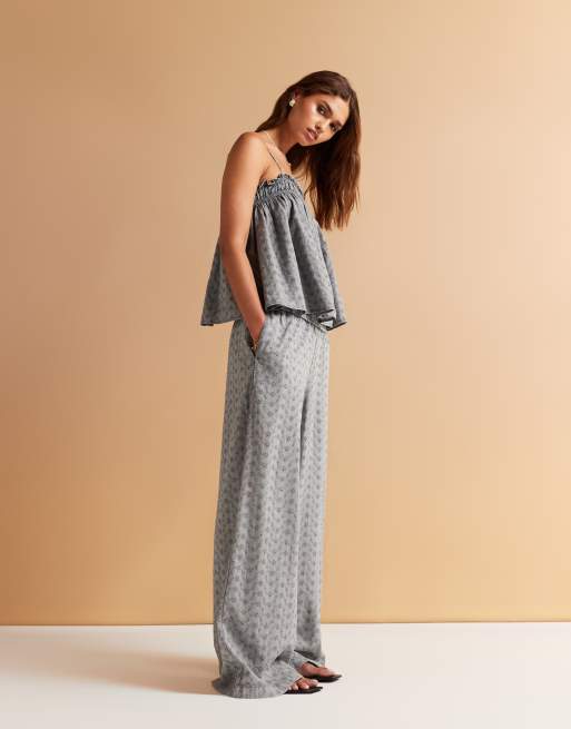 ASOS DESIGN - Broek van broderie met gesmokte taille en wijde pijpen in grijs met wassing, deel van co-ord set