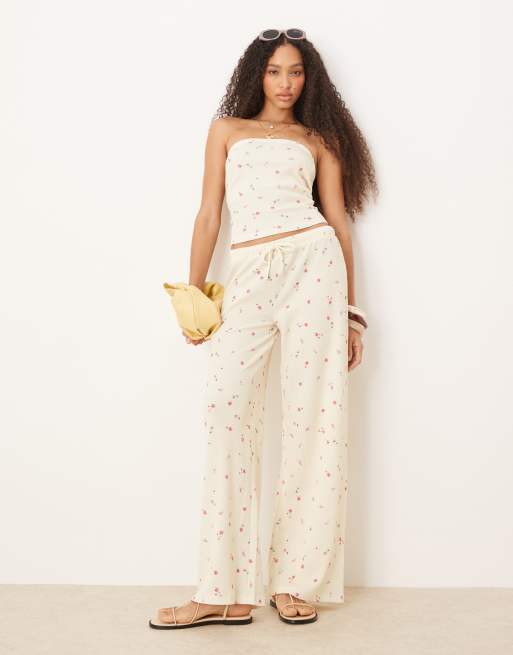ASOS DESIGN - Broek van co-ord set met wijde pijpen, wafelstructuur en fijne print in citroengeel
