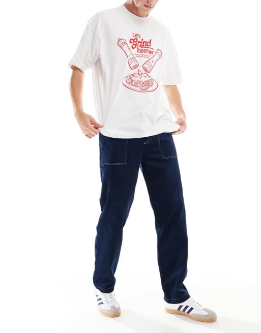 ASOS DESIGN - Broek van corduroy met rechte pijpen en contrasterende stiksels in marineblauw