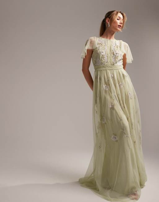 ASOS DESIGN - Bruidsmeisjes - Lange jurk met fladdermouwen versierd met pareltjes en geborduurde bloemen in saliegroen