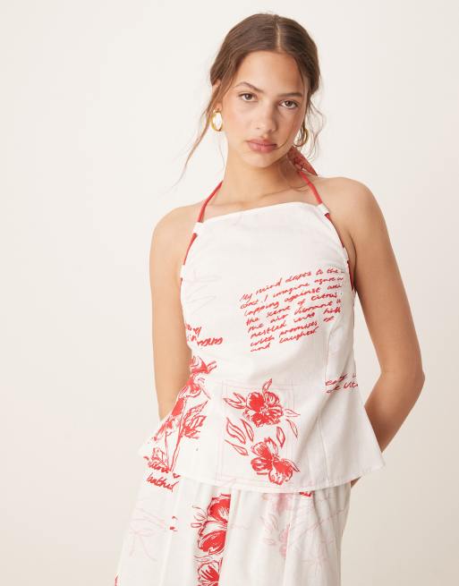 ASOS DESIGN - Cami met halternek met gestrikte touwtjes in rode bloemenprint, deel van co-ord set