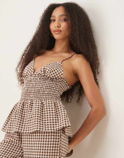 ASOS DESIGN - Camitop met gesmokte taille in bruine gingham ruit