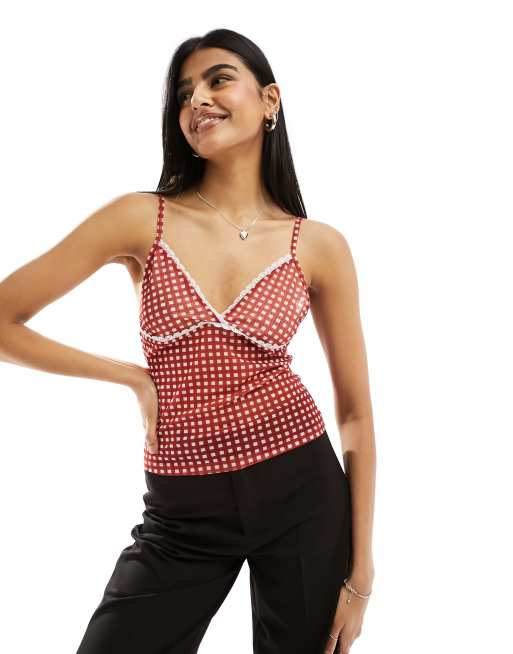 ASOS DESIGN - Camitop van mesh met met contrasterende rand in rode gingham ruit