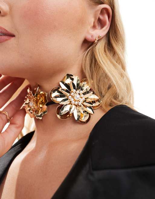 ASOS DESIGN - Choker ketting met dubbele corsage in goudkleur