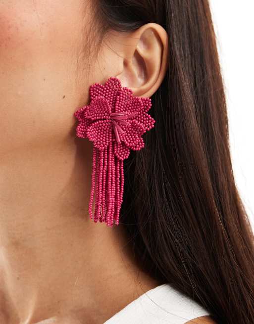 ASOS DESIGN - Clip on oorhangers met bloemmotief met kralen in felroze