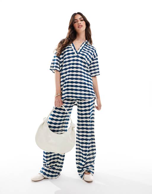 ASOS DESIGN - Co-ord set van gestreept T-shirt met V-hals en broek met textuur in marineblauw