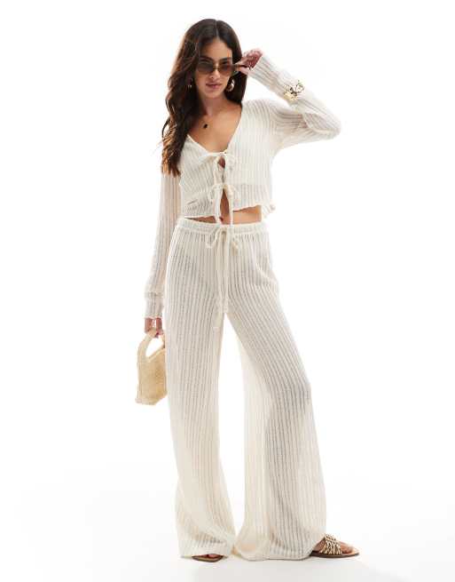 ASOS DESIGN - Co-ord set van opengewerkte top, bh en broek met wijde pijpen en textuur in stone