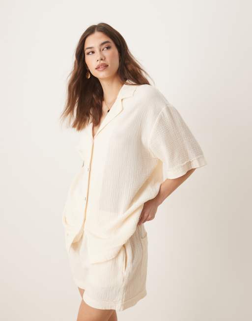ASOS DESIGN - Co-ord set van overhemd en short met elastische taille van kaasdoek in crème