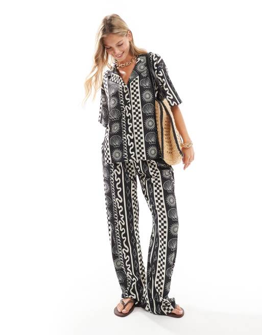 ASOS DESIGN - Co-ord set van recht overhemd en broek met vakantie-schelpenprint in zwart-wit