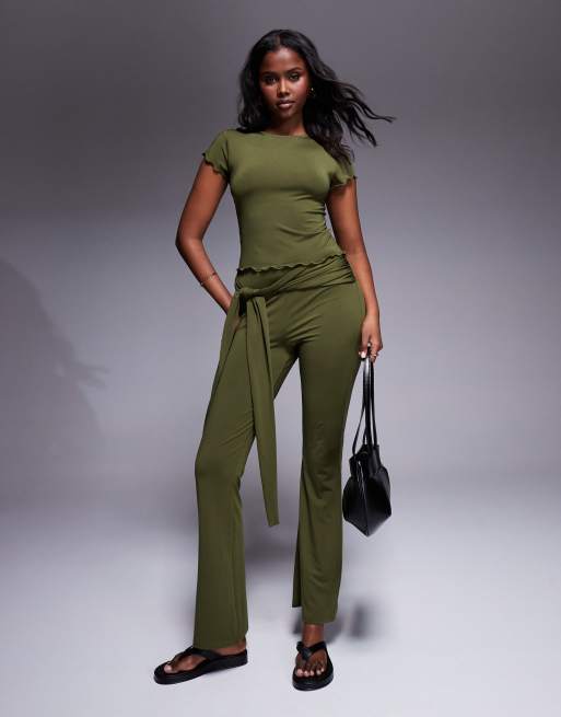 ASOS DESIGN - Co-ord set van top met korte mouwen en flare-broek van gladde stof in kaki