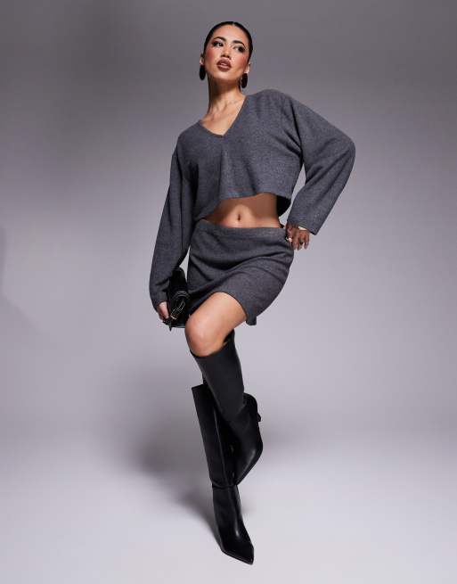 ASOS DESIGN - Co-ord set van top met lange mouwen en V-hals en mini rok in antracietgrijs