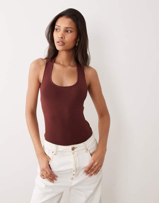 ASOS DESIGN - Compact gebreide cami met gekruiste achterkant in chocoladebruin