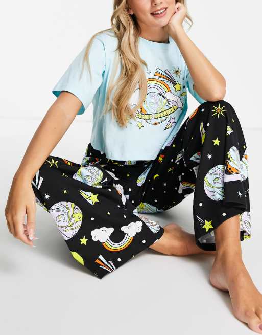 ASOS DESIGN - Cosmic Dreamer Space - Pyjamaset met T-shirt en broek in blauw & zwart