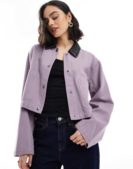 ASOS DESIGN - Cropped jack met wassing en kraagje met leerlook in grijs en lila