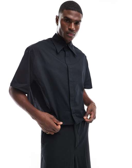 ASOS DESIGN - Cropped poplin overhemd met rechte pasvorm en kraagje in jaren 70-stijl in zwart