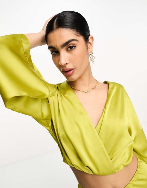 ASOS DESIGN - Cropped satijnen overhemd in helder groen, deel van co-ord set