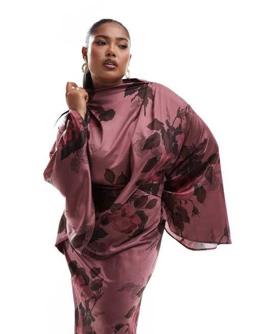 ASOS DESIGN Curve - Maxi jurk van satijn met overslag, gedrapeerd lijfje en kimonomouwen in roze met bloemenprint