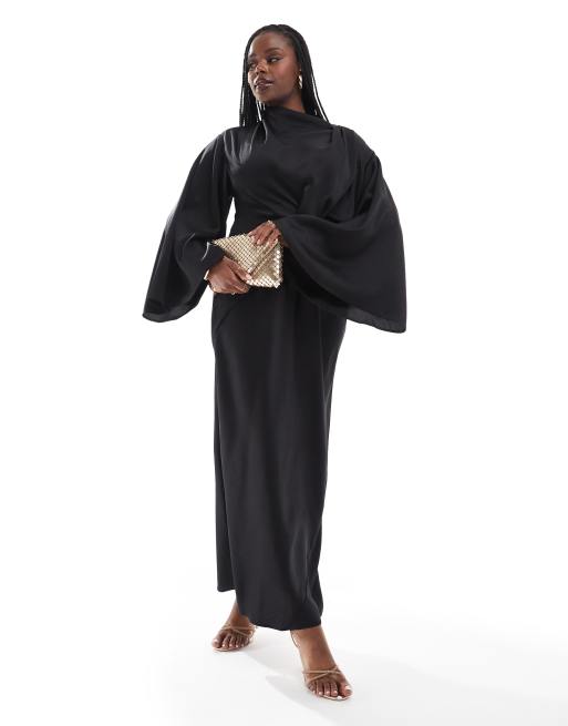 ASOS DESIGN Curve - Maxi jurk van satijn met overslag, gedrapeerd lijfje en kimonomouwen in zwart