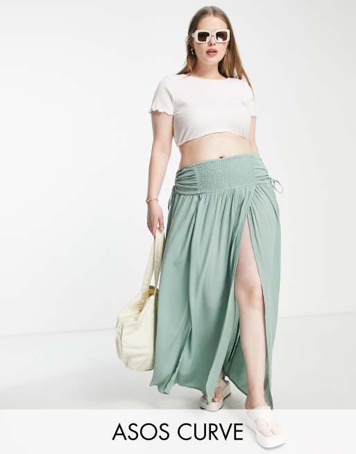 ASOS DESIGN Curve - Maxi rok van kreukelstof met gesmokte taille en gerimpelde zijkanten in kaki