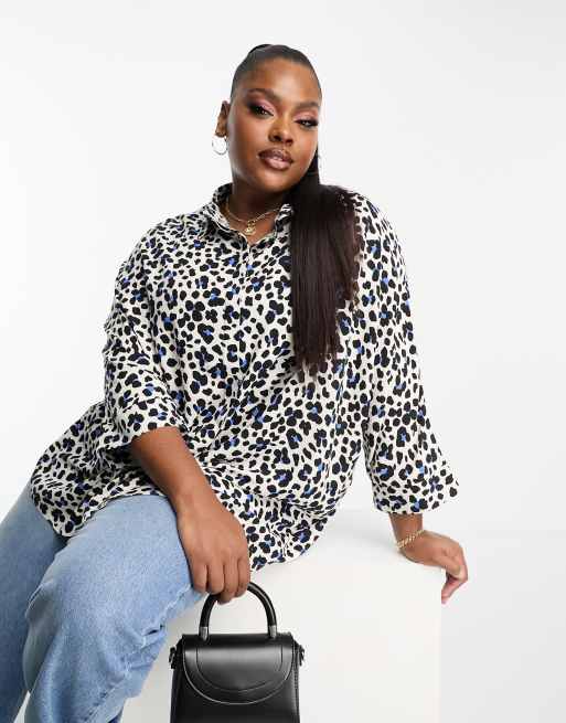 ASOS DESIGN Curve - Oversized overhemd met lange mouwen in blauwe luipaardprint