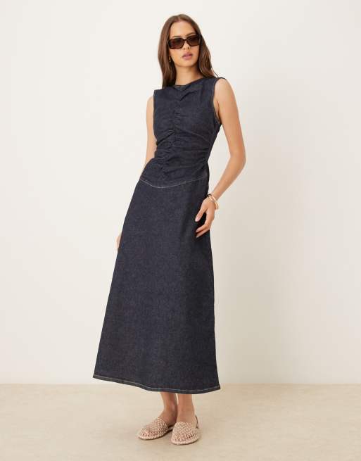 ASOS DESIGN - Denim jurk met korte mouwen en verlaagde aangerimpelde in rinse wash