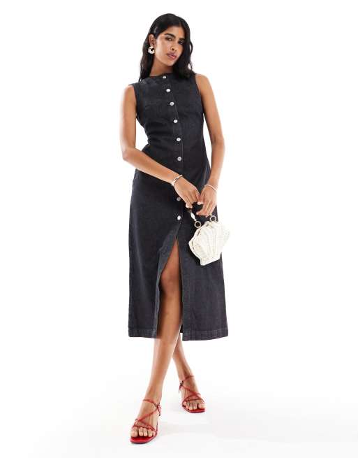 ASOS DESIGN - Denim maxi-jurk met ronde hals en knoopsluiting aan de voorkant in zwart met wassing