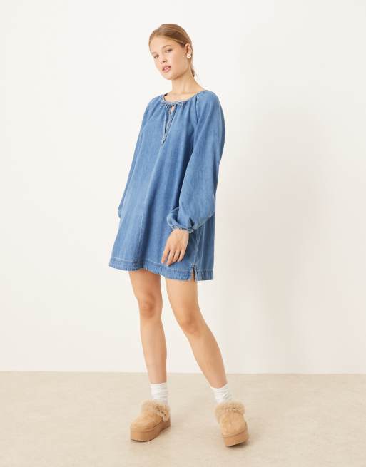 ASOS DESIGN - Denim mini jurk met ballonmouwen in mid-wash blauw