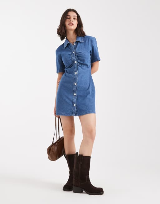 ASOS DESIGN - Denim mini-jurk met gerimpelde voorkant in middenblauw