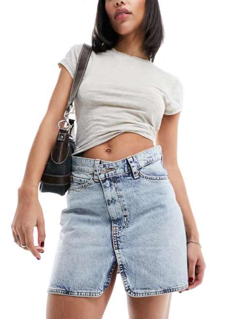 ASOS DESIGN - Denim mini rok met gekruiste taille in lichte wassing