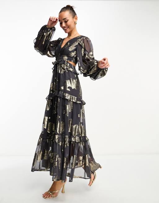 ASOS DESIGN - Diepuitgesneden maxi-jurk met platgestikte plooitjes, uitsnijding en ruches in metallic gebloemd jacquard in antraciet