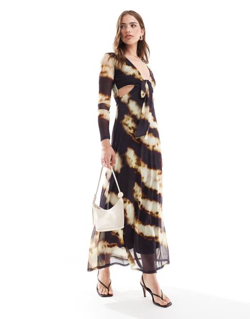 ASOS DESIGN - Diepuitgesneden maxi jurk van mesh met gestrikte voorkant, uitsnijdingen en vlekkenprint