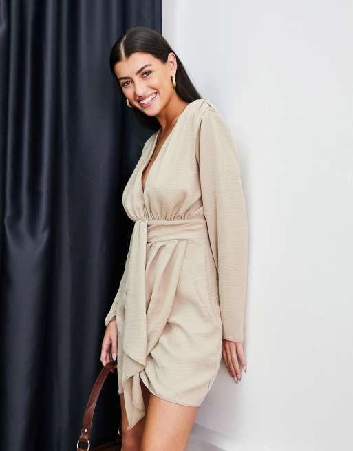 ASOS DESIGN - Diepuitgesneden mini jurk met gedrapeerde wikkelrok in camel