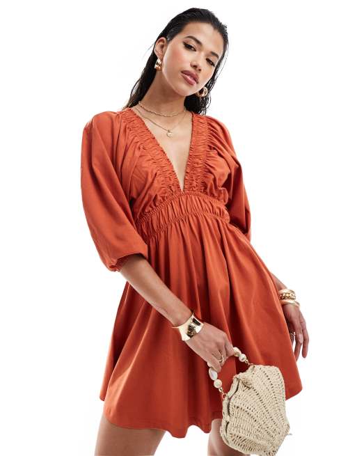 ASOS DESIGN - Diepuitgesneden nette mini-jurk met ruches in terracotta