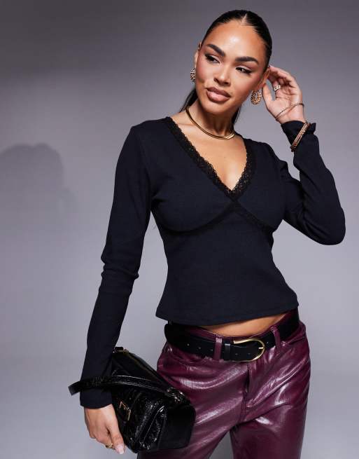 ASOS DESIGN - Diepuitgesneden top met kanten rand en lange mouwen in zwart