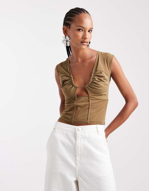 ASOS DESIGN - Diepuitgesneden top met paneel van doorschijnende mesh in kakigroen