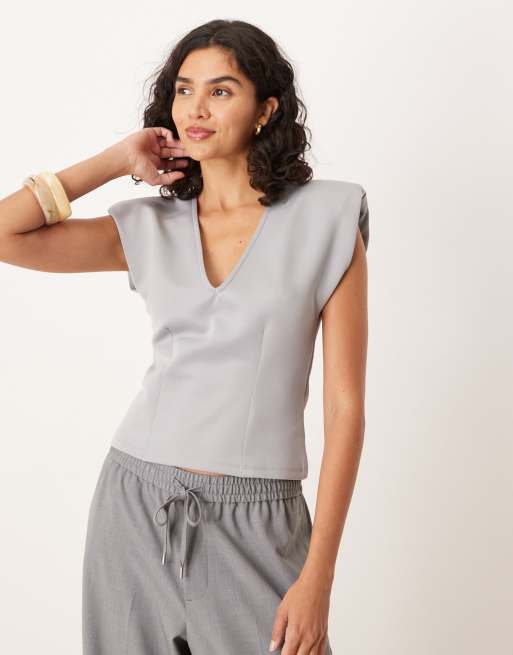 ASOS DESIGN - Diepuitgesneden top van scuba-achtige stof met schoudervullingen in grijs