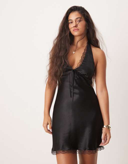 ASOS DESIGN - Diepuitgesnenden satijnen jurk met halternek en kanten rand in zwart