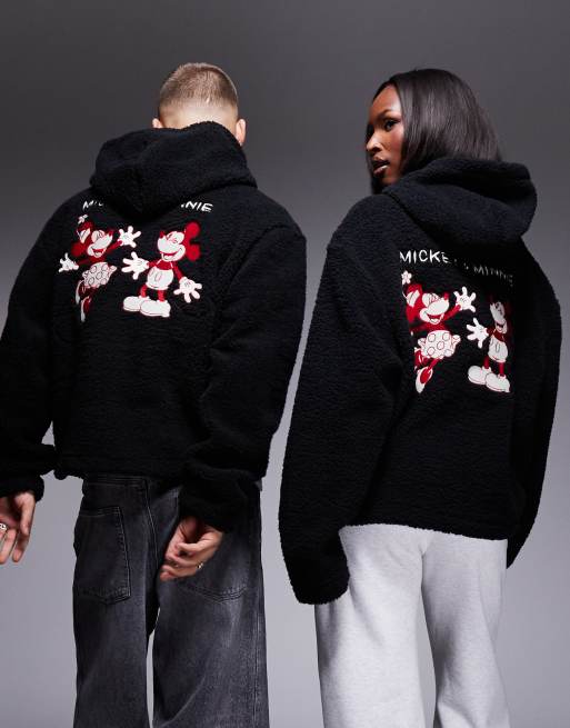 ASOS DESIGN - Disney - Uniseks oversized hoodie van borg met rechte pasvorm en borduursels van Mickey Mouse en Minnie Mouse in zwart